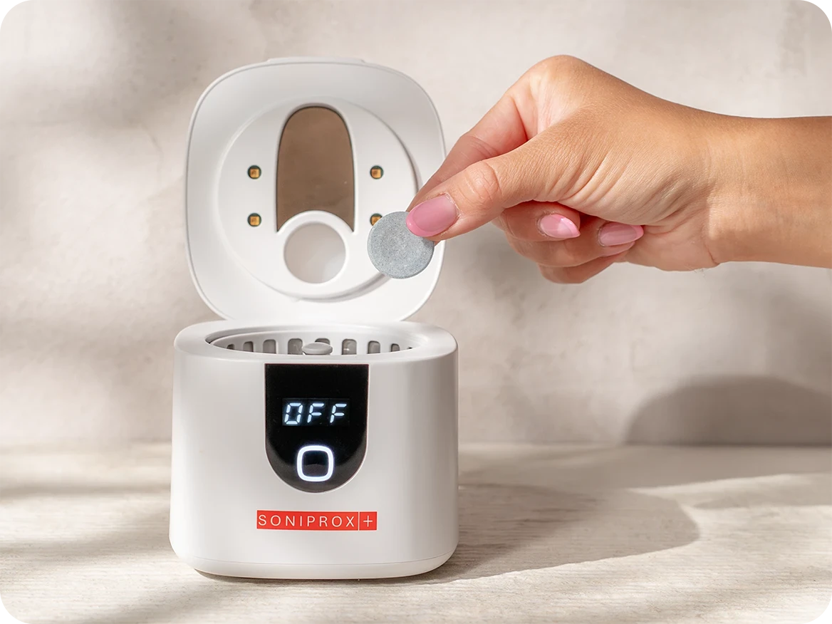 Wystarczy umieścić aparat lub protezę w Soniprox+ Ultrasound Cleaner, dodać tabletkę i włączyć cykl czyszczenia przewidziany w protokole UHP+™. Po kilku minutach elementy są idealnie czyste, odświeżone i gotowe do użycia. To szybki, bezpieczny i wygodny sposób na codzienną higienę, który zapewnia pełen komfort użytkowania każdego dnia.
