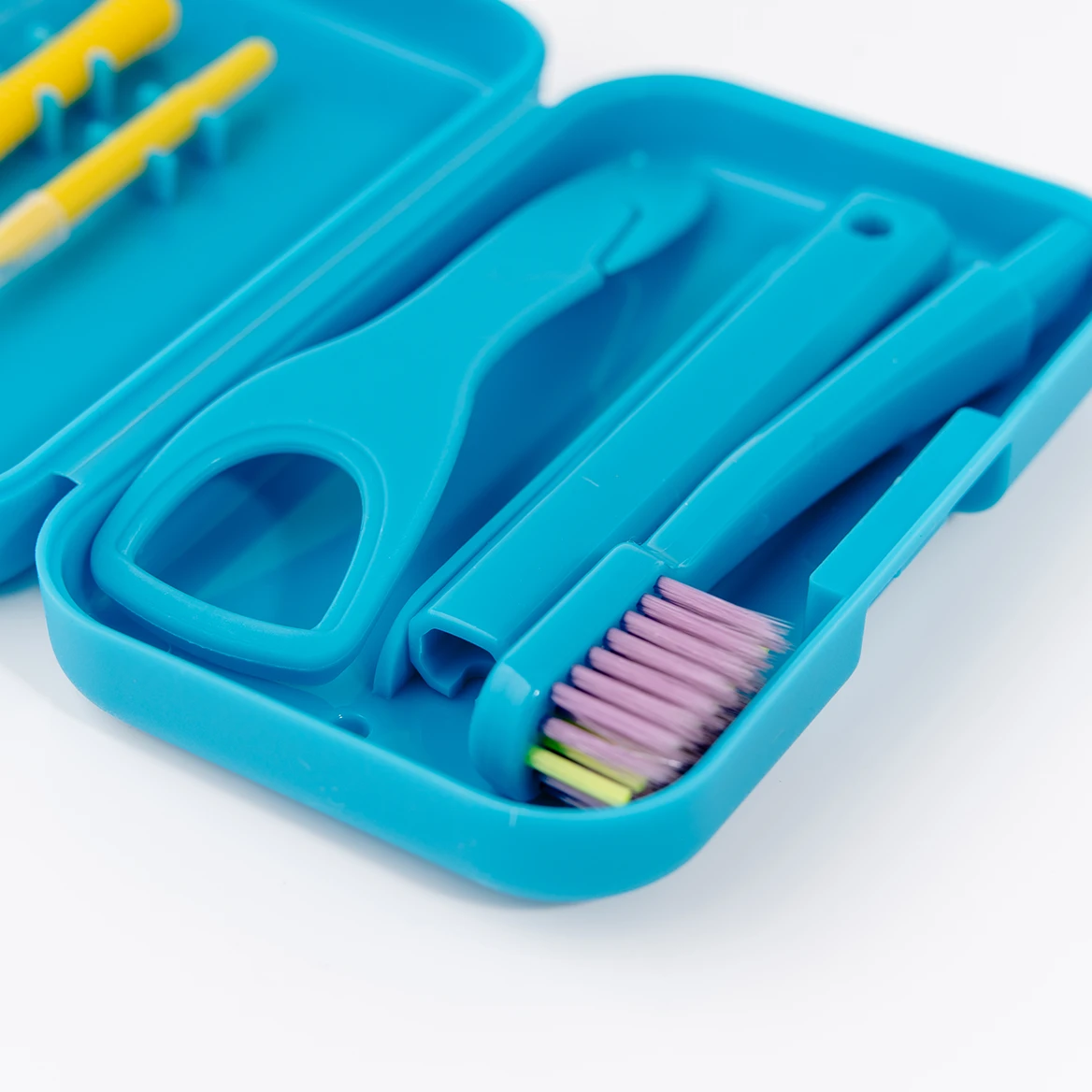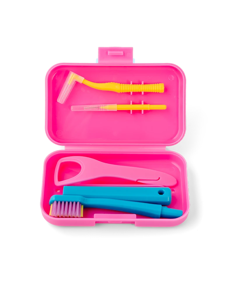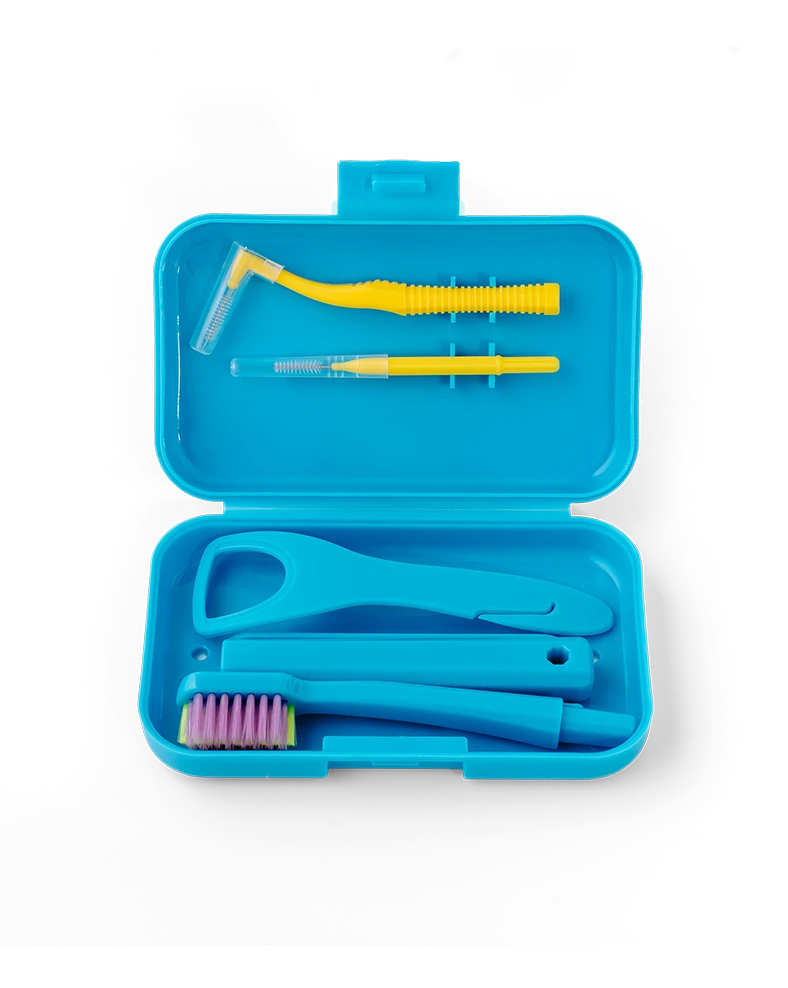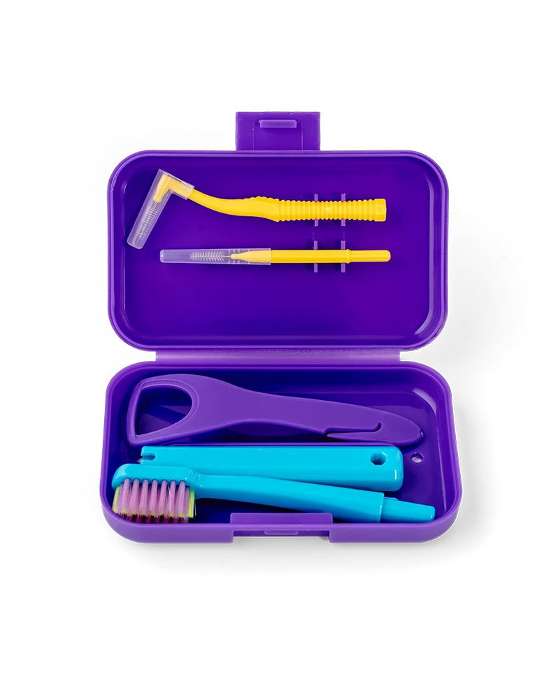 Szczoteczka w zestawie jest składana przez co łatwo można ją przewozić w pudełku oraz twardość jej włókien jest dostosowana do możliwości bezpiecznego użycia na delikatnych powierzchniach nakładek ortodontycznych, aparatów ruchomych, retainerow i protez bez ryzyka uszkodzenia.